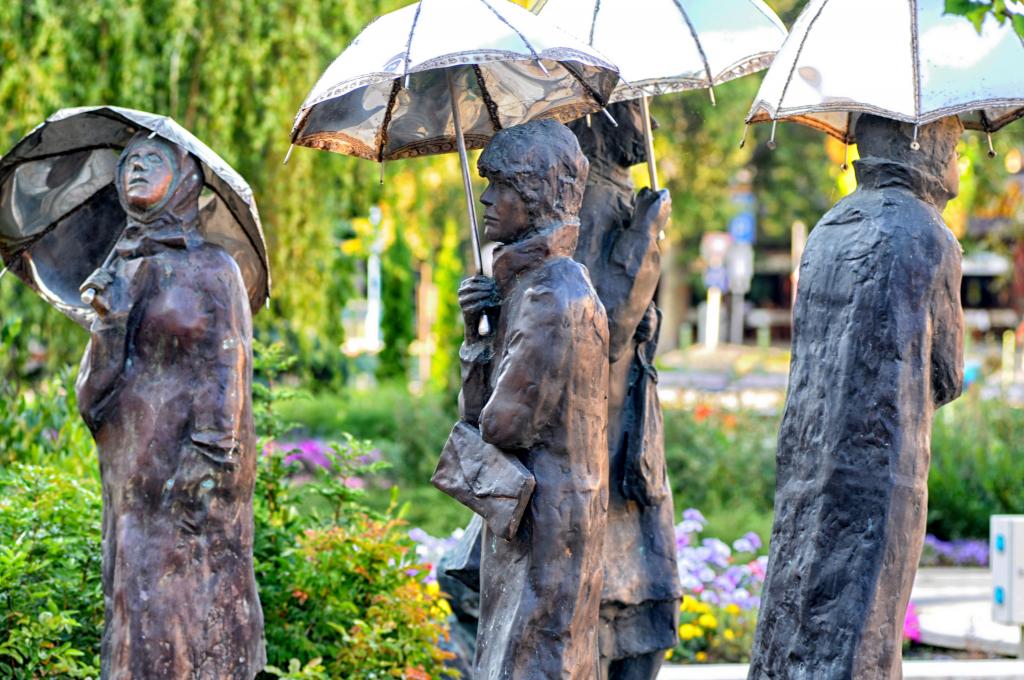 Varga Imre szobrászművész kompozíciója négy életnagyságú, esernyőt tartó nőalakot ábrázol.