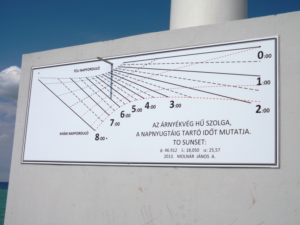 A siófoki kikötő mólójának végét díszítő Angyal szobor Pjotr Sztronszkij alkotása. A móló felújítását és az új szobor talapzatát Bíró József siófoki mérnök tervezte, a kivitelezéseket a BAHART munkatársai 2013-ban végezték. A talapzaton lévő kb. 60x120 cm méretű függőleges, fali napórát ugyancsak dr. Molnár János mérnök tervezte és a BAHART munkatársai készítették. Az árnyékvető a falra merőleges, vízszintes, rövid pálca. Az óra skálája manapság már meglehetősen ritka fajtájú: azt az időtartamot mutatja, ami a Nap lenyugvásáig még hátra van a nappalból. Így nem kellenek a napórák pontosságát növelő időegyenleggel és a zónaidőkkel kapcsolatos korrekciók. Ilyen skálákat használtak az ókori Babilóniában, majd később Itáliában. Az óravonalak skálája 30 percenkénti osztású és óránkénti számozású. A naptár lehetőség itt is megtalálható: az állatövi jegyekhez igazodó tavaszvonal és a téli-nyári napfordulónak megfelelő két szélső hiperbola ív ad tájékozódási lehetőséget. A napóra magyar és angol felirata szerint Az árnyékvető hű szolga, a napnyugtáig tartó időt mutatja. – és ezzel utal a BAHART „Naplemente túráira”. A mólót és építményeit (szobor, napóra) is felvette 2017-ben a siófoki Önkormányzat az egyedi értékvédelemre méltó építményei jegyzékébe.